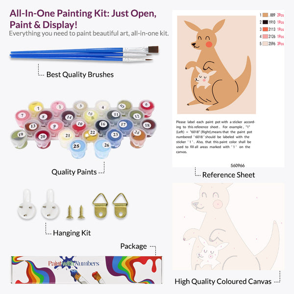 A unique combination of real image and abstraction is a true work of art. Kangaroo Paint by Numbers for Kids will undoubtedly decorate your interior, and no one will guess that it is not painted by the artist.